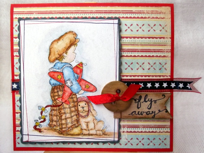 I've colored the beautiful stamp Fly Away with my watercolor pencils, used paper from my stash and got the White Stars on Navy ribbon from here. The wooden button was a gift from grandma along with other vintage buttons. I think it did a great job holding all the elements together.